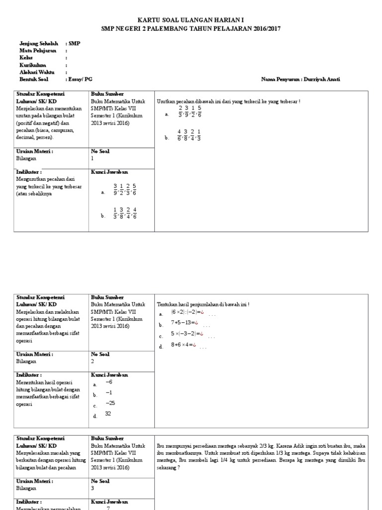 Kisi Kisi Soal Pas Matematika Kelas 7 Semester 1 Kurikulum