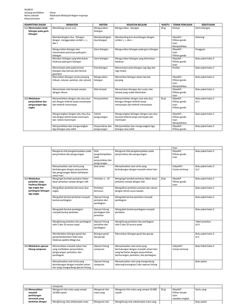 Silabus Matematika Kelas 3 Smtr 1