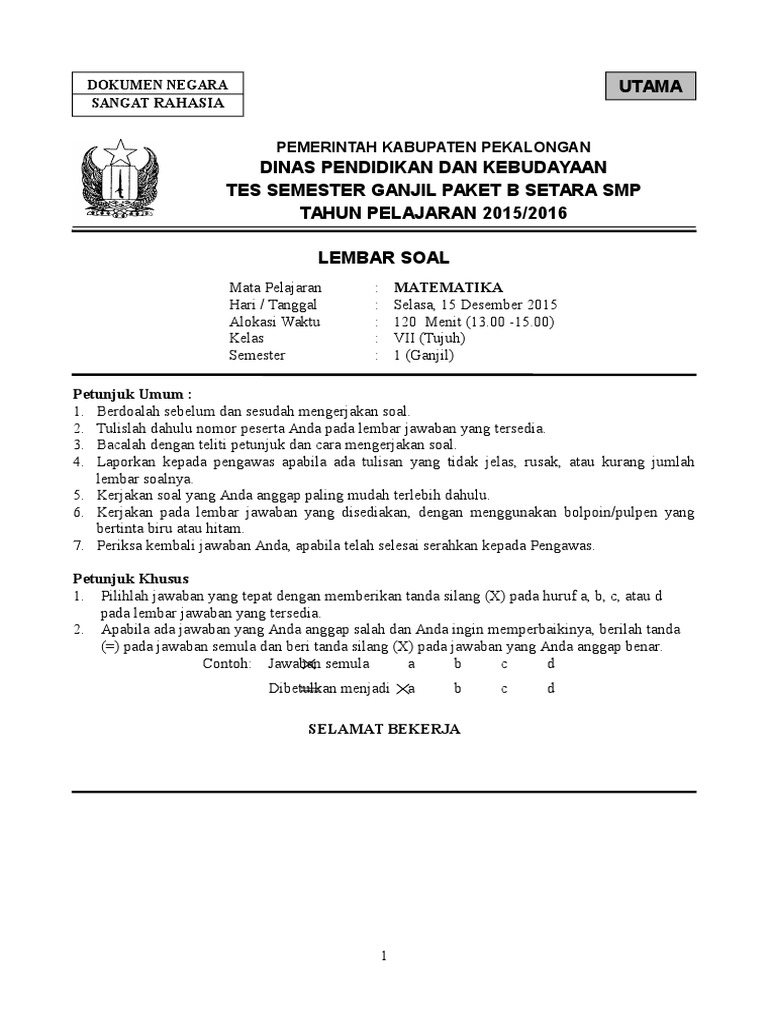 Soal Tes Semester Gasal Paket B Setara Smp Kelas Vii