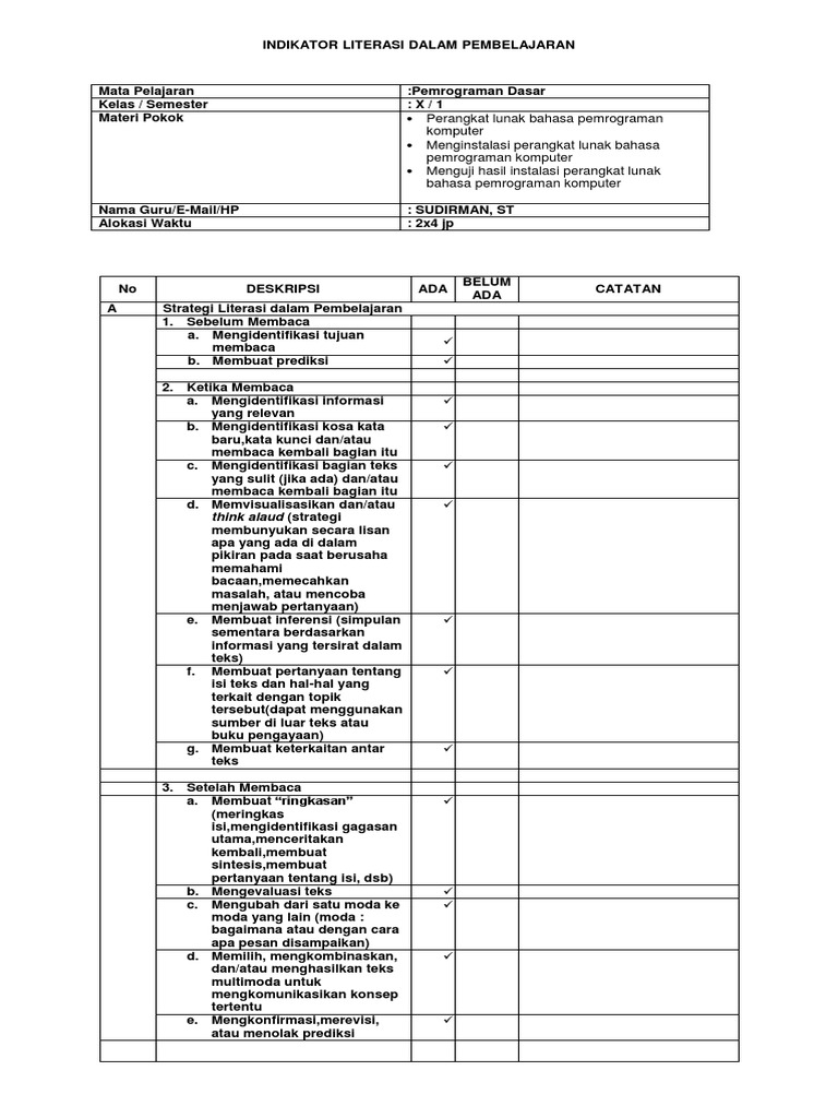 Daftar Cek Literasi Dalam Pembelajaran
