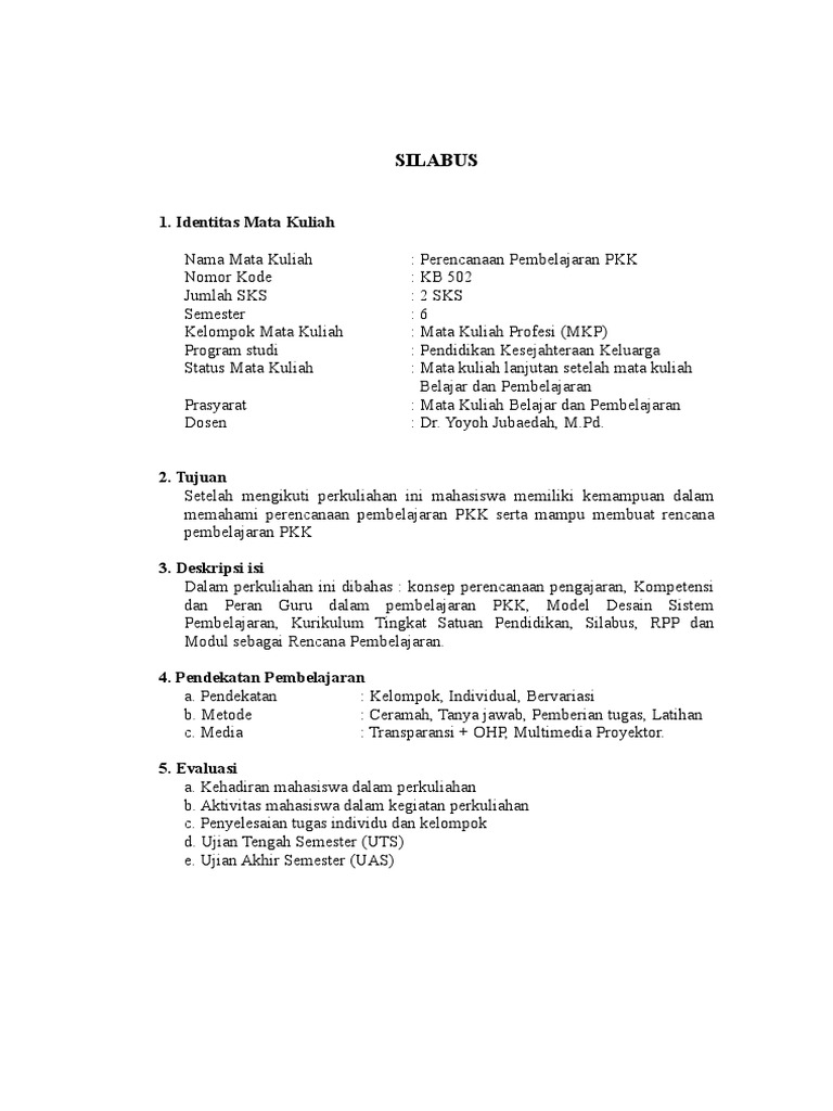 Silabus Belajar Pembelajaran Pkk 1