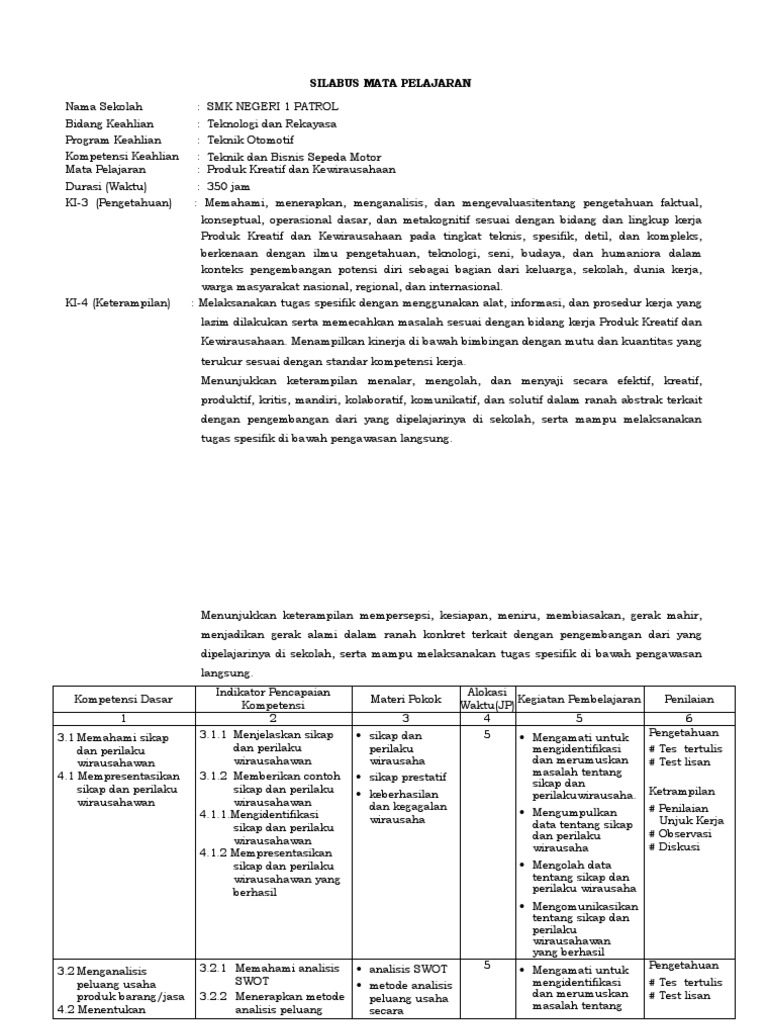 Contoh Rpp Mata Pelajaran Produk Kreatif Dan Kewirausahaan Kelas 12