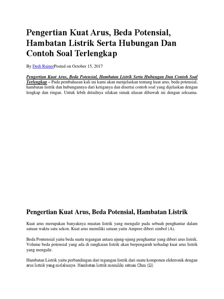 Pengertian Kuat Arus Beda Potensial Hambatan Hubungan Contoh Soal
