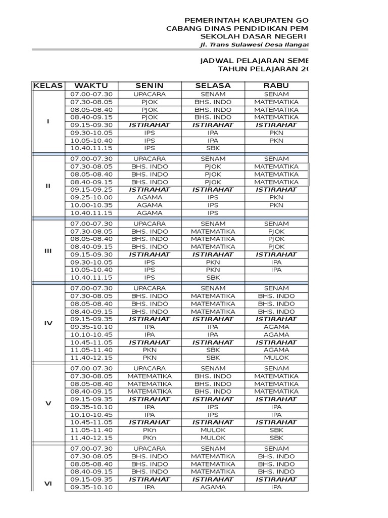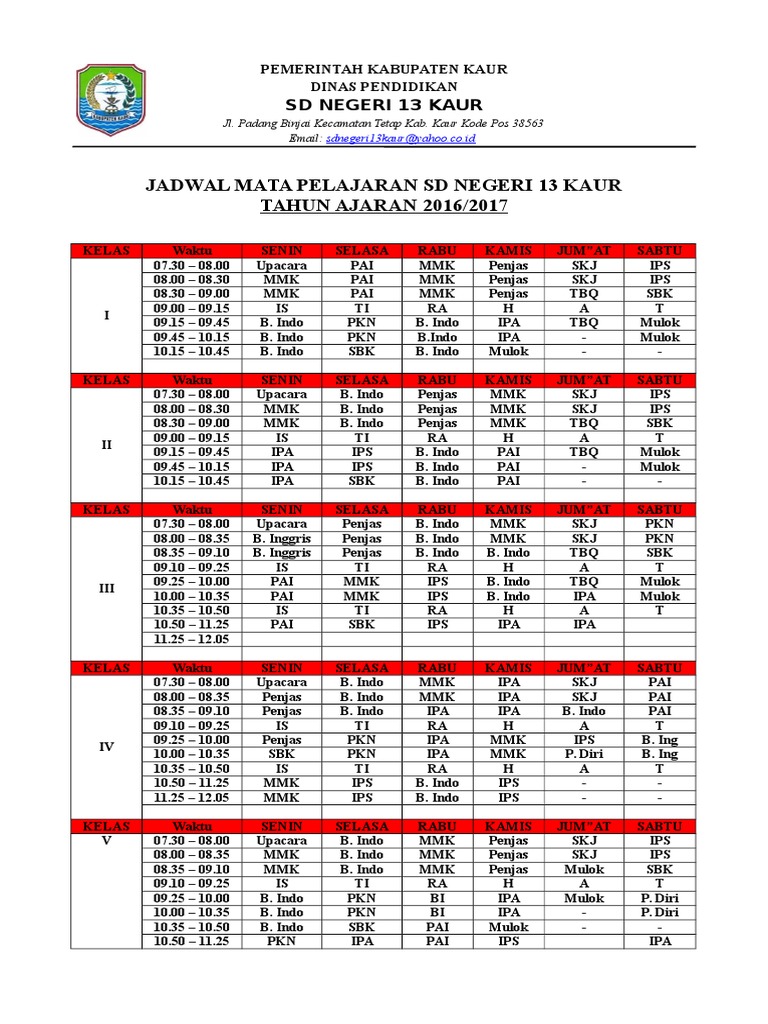 Jadwal Pelajaran Sd Kelas 1 2 3 4 5 Dan 6 Tahun Pelajaran 2018 2019