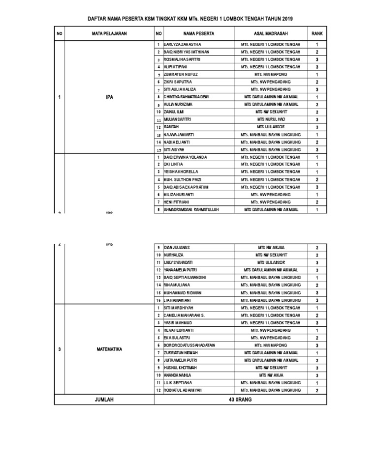 Peserta Ksm Tk Kkm Mtsn 1 Loteng Per Mapel 2019