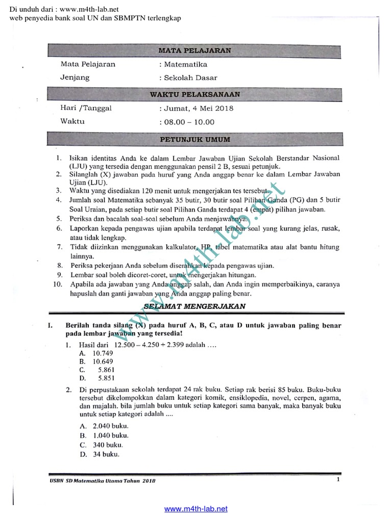 Download Soal Usbn Sekolah Dasar Sd Tahun 2018 Bidang Matematika