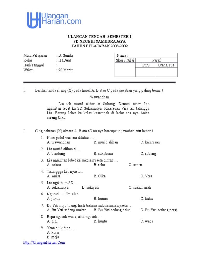 Soal Uts Bahasa Sunda Kelas 2 Sd Semester 1