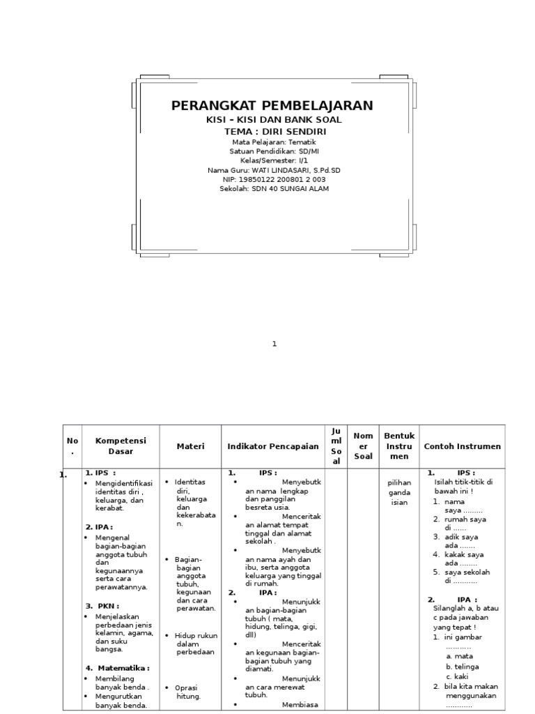 Kisi Kisi Soal Kelas 1 Tematik