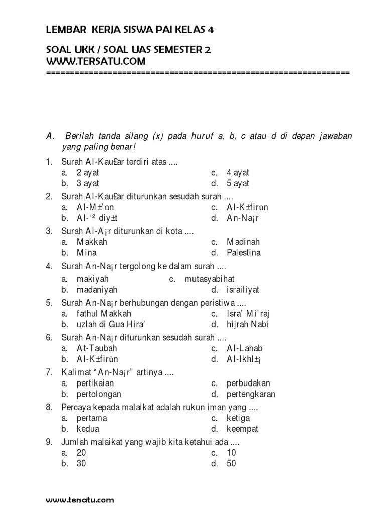 Soal Ujian Uas Ukk Pai Kelas 4 Sd Semester 1