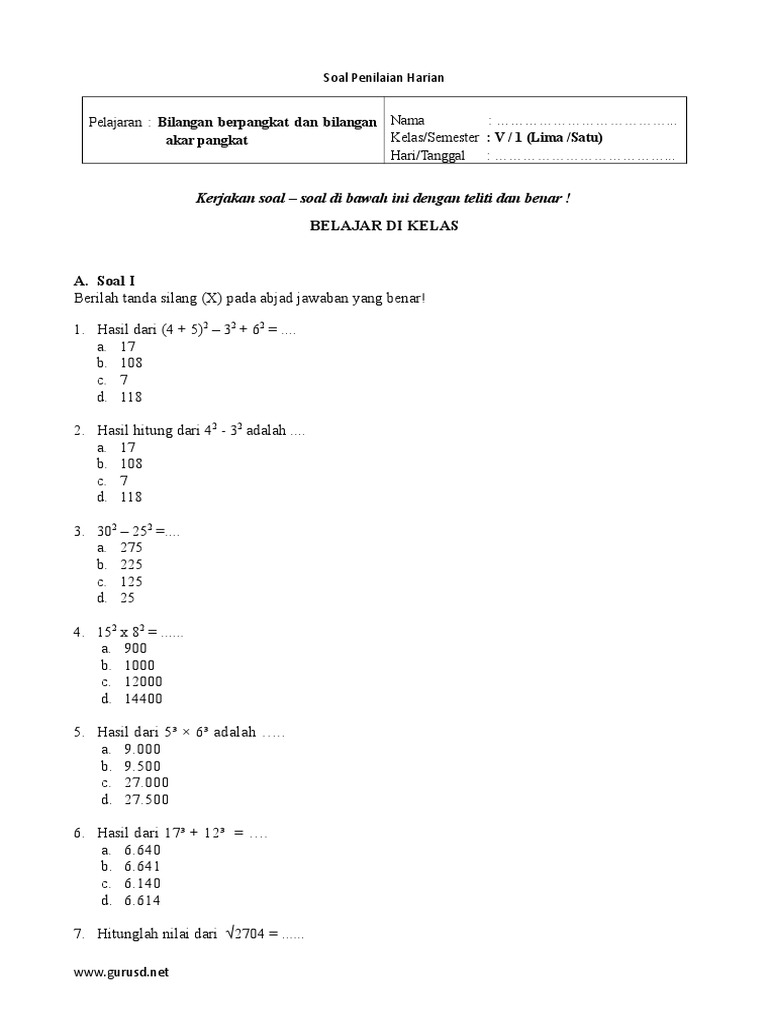 Ruang Belajar Siswa Kelas 1 Contoh Soal Bilangan Berpangkat