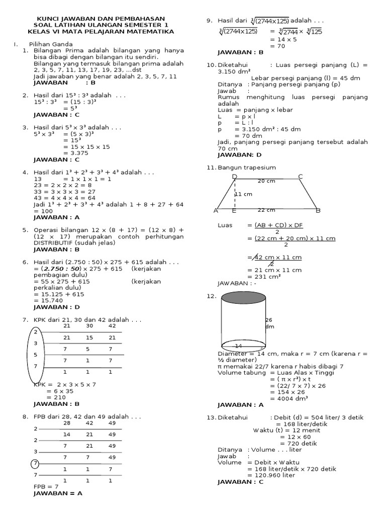 Soal Uas Matematika Kelas 6 Semester 1 Plus Kunci Jawaban