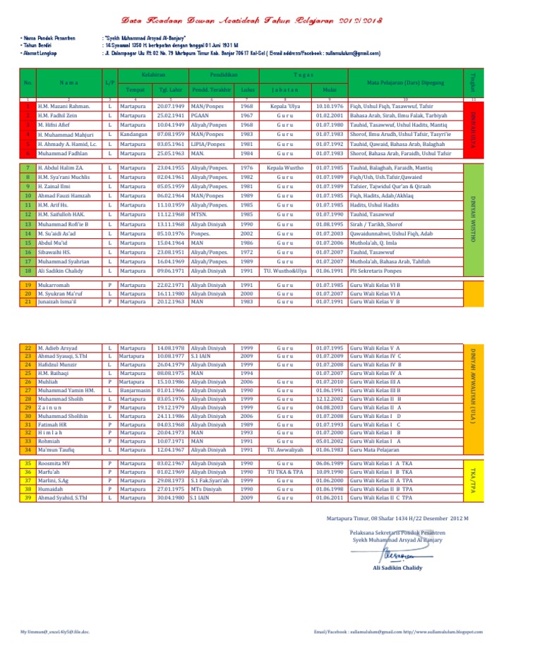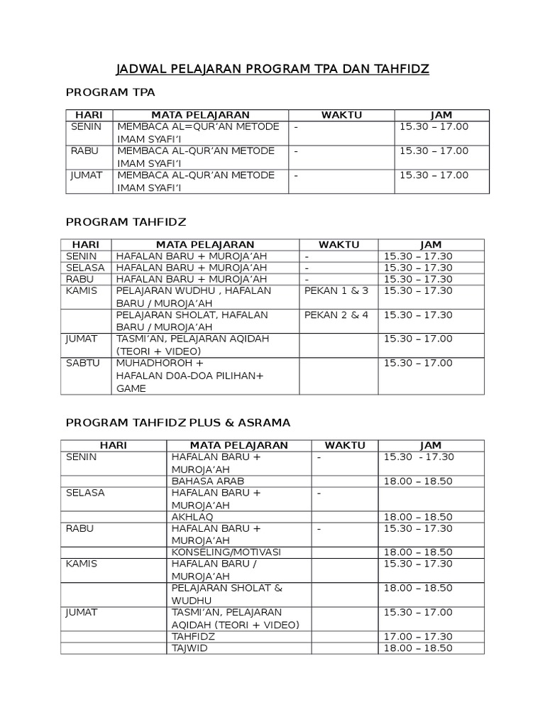 Jadwal Mata Pelajaran Tpa Ar Ridlo Tirtomulyo