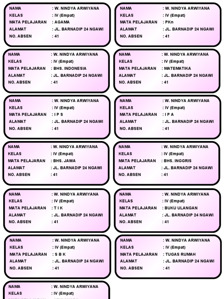 Stiker Label Nama Sekolah Kelas Alamat Mata Pelajaran