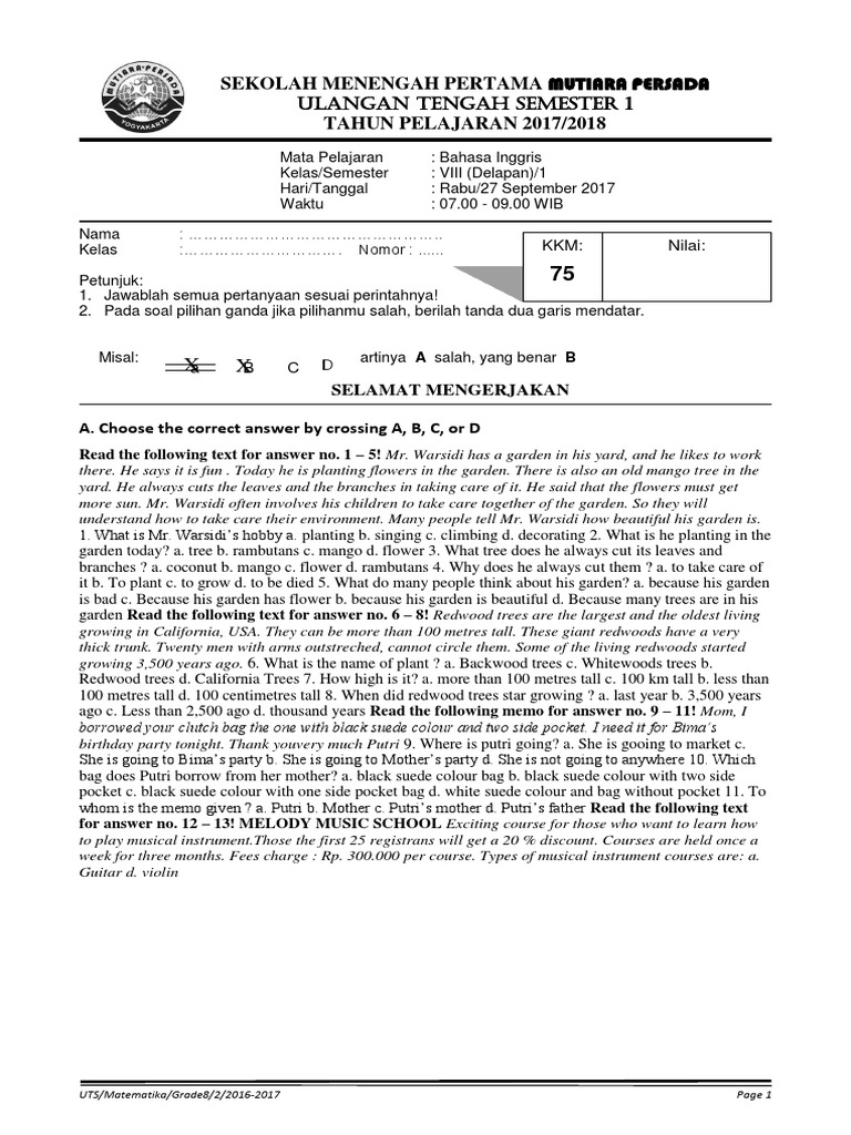 Ulangan Tengah Semester Bahasa Inggris Kelas 8 Semester 1 Sequoia