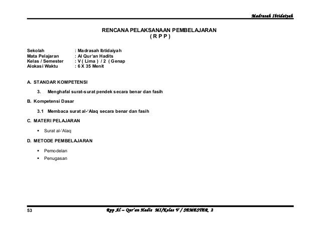 Rpp Al Qur An Hadits Madrasah Ibtidaiyah Kurikulum 2013 Kelas 1 2 3