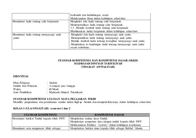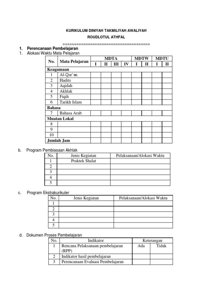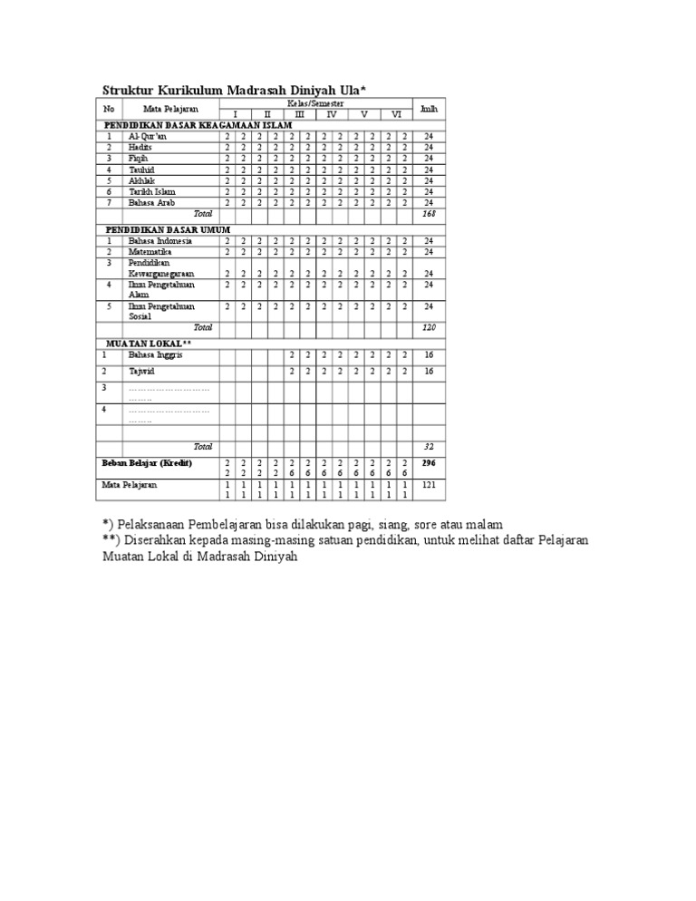 Kurikulum diniyah ula memuat 11 mata pelajaran muatan lokal dan pengembangan diri seperti terdapat pada tabel struktur kurikulum du. Minggu efektif belajar adalah jumlah minggu kegiatan pembelajaran untuk setiap tahun pelajaran pada diniyah takmiliyah. Madrasah diniyah takmiliyah ialah suatu sutu pendidikan keagamaan.