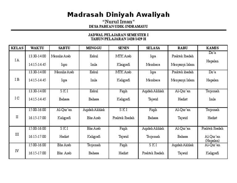 Mata pelajaran diniyah. Kelas tingkat iqra. Jadwal pelajaran santri diniyah takmiliyah. Mampu membaca dan meunulis teks berbahasa arab yang sesuai dengan tema tema pokok yang berkorelasi dengan mata pelajaran.