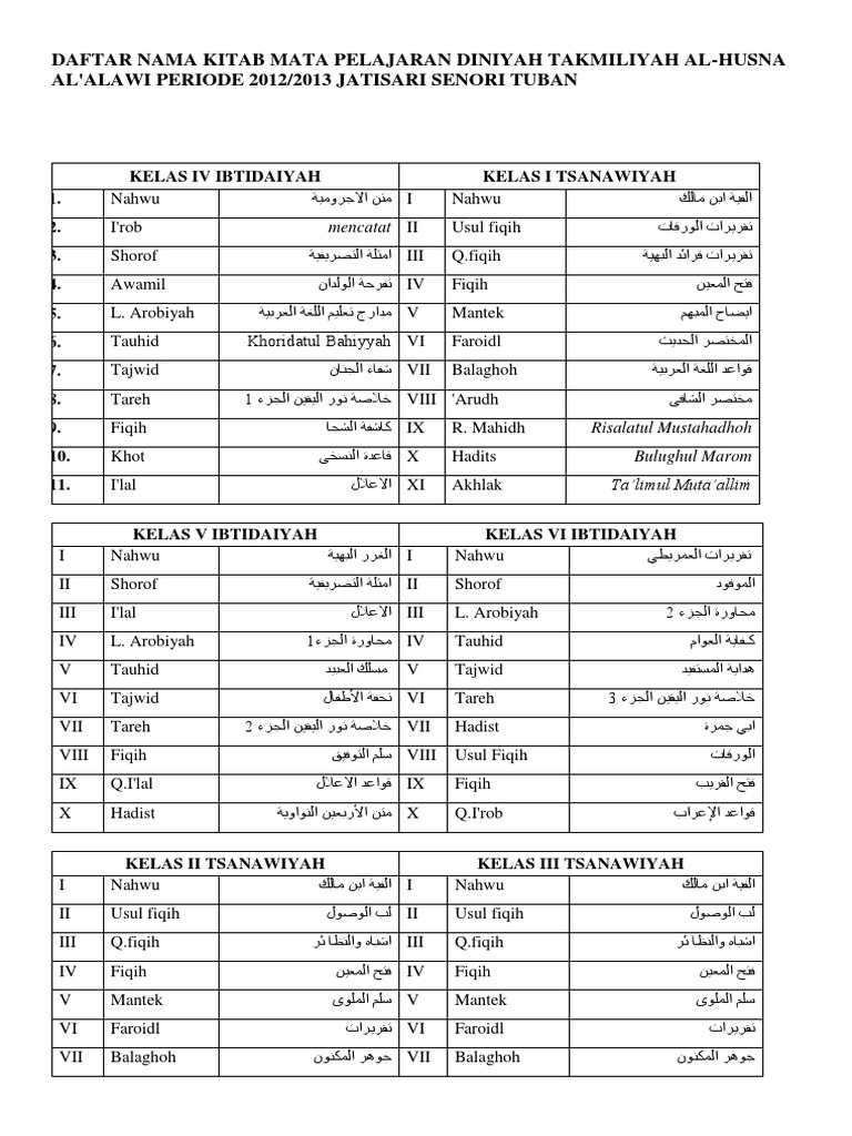 Daftar Nama Kitab Mata Pelajaran Diniyah Dan Mts Docx