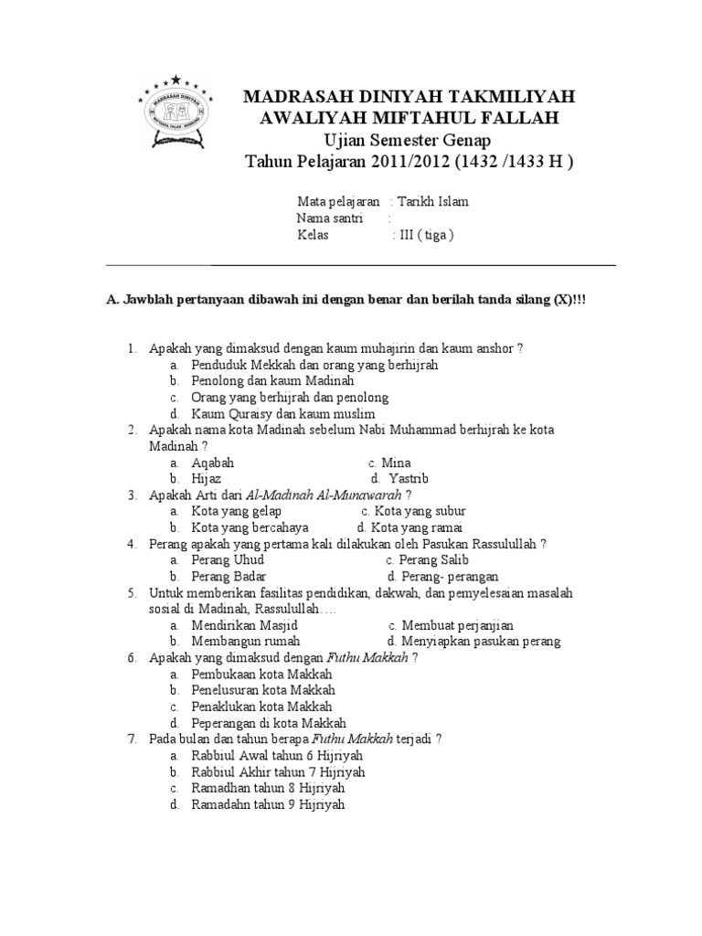 Soal Tarikh Islam Kelas Iii Semester 1