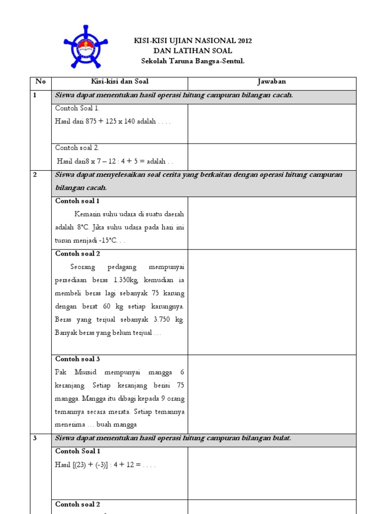 Contoh Soal Dan Kisi Kisi Ujian Nasional Sd Mi Dan A Operasi