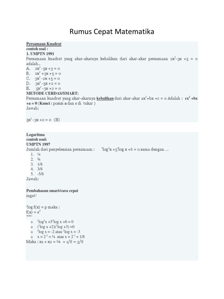 Rumus Cepat Matematika Persamaan Kuadrat Contoh Soal 1