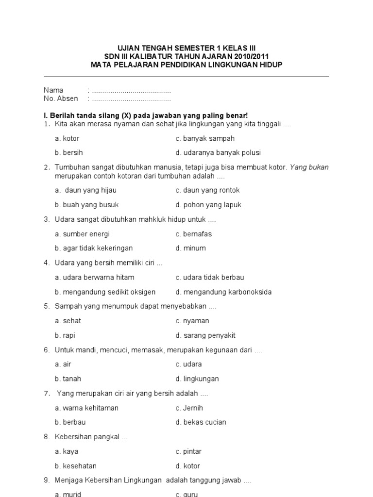 Ujian Tengah Semester 1 Kelas Iii Pendidikan Lingkungan Hidup