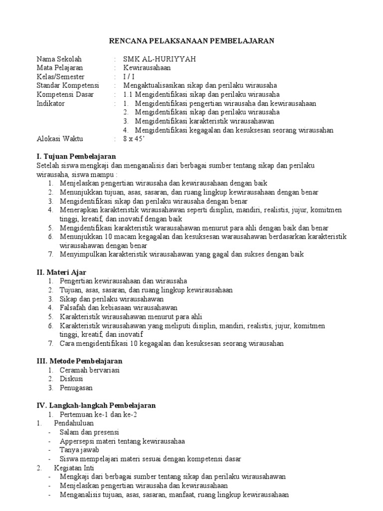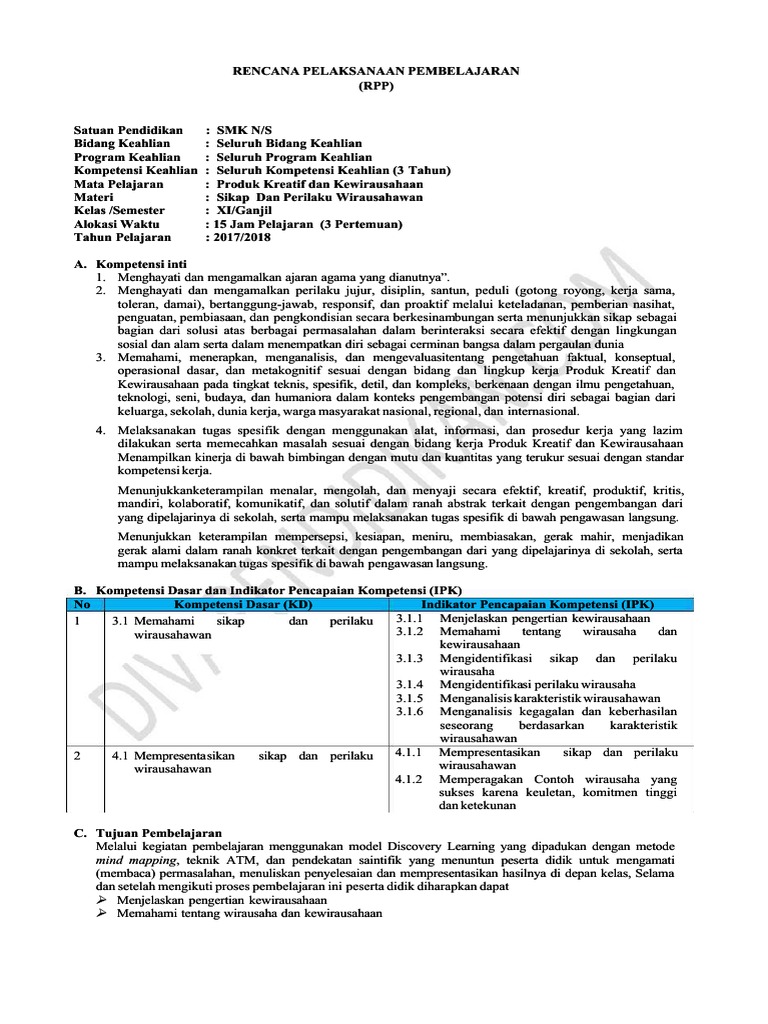 Rpp Produk Kreatif Dan Kewirausahaan Kd 3 1 Sikap Dan Prilaku