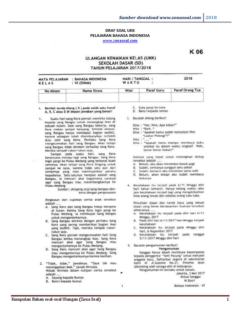 Soal Ukk Bahasa Indonesia Kelas 6 1