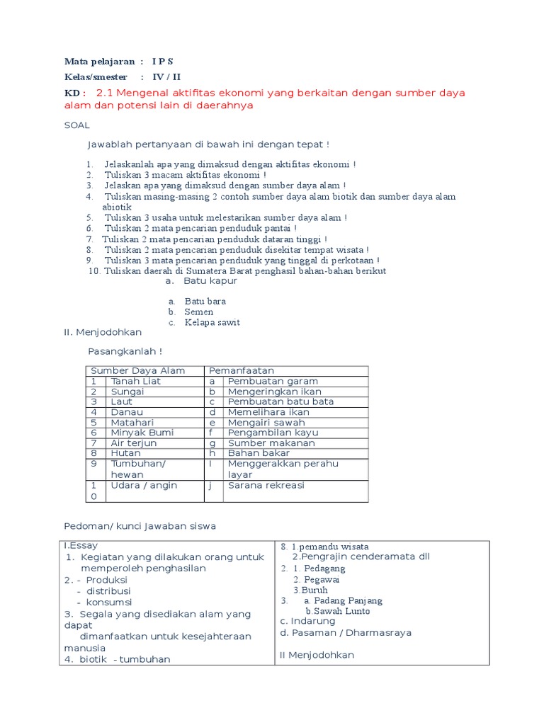 Soal Ips Kelas 4 Sd Bab Sumber Daya Alam Dan Kegiatan